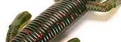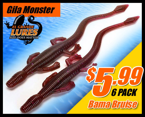 | The Gila Monster is an 8.75" soft plastic lizard. The Gila Monster was designed for a myriad of fishing techniques such as flipping, pitching, Texas Rigging, and Carolina Rigging. The Gila Monster tends to float straight up when Texas Rigged and is a deadly presentation on bedding bass. We have found that strikes are vicious on this lure and can only assume that bass are trying to kill this lizard. We recommend at the minimum a 5/0 Wide gapped hook and have used up to 7/0 hooks with success. |